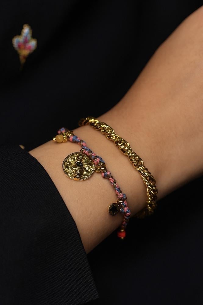 إسوارة بخيط ملون يضفي حيوية على مظهرك، مزينة بتعليقة ذهبية أنيقة تمنحك توازن مثالي بين البساطة والتميز. خيار مثالي لإطلالة كاجوال عصرية أو تنسيقات يومية خفيفة.