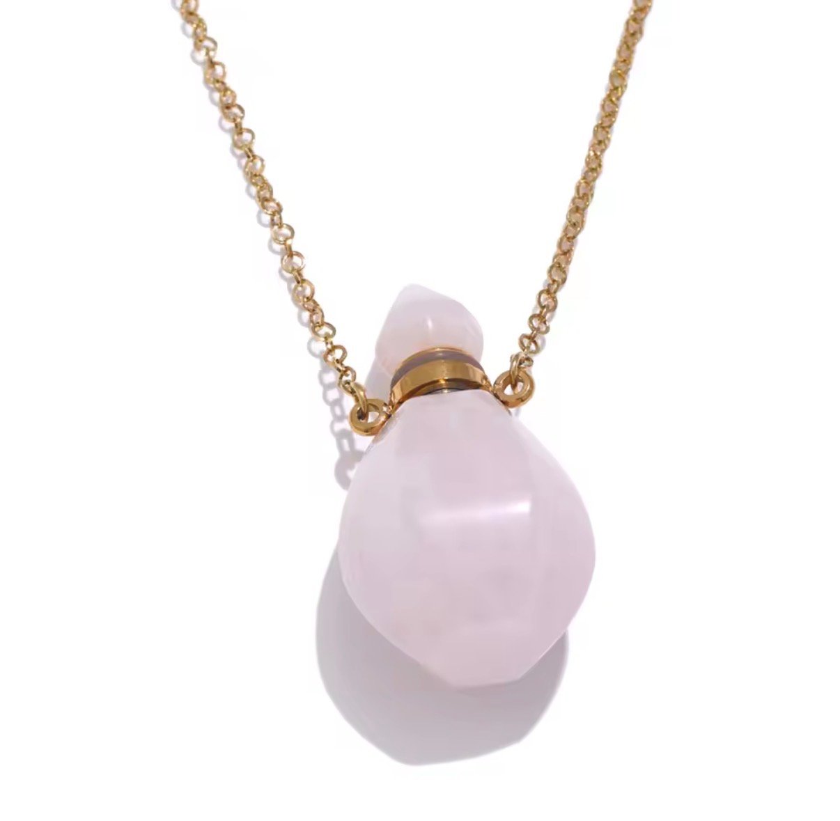 قلادة طويله ناعمه بتصميم زجاجة صغيرة مصنوعة من حجر الكوارتز الوردي (Pink Quartz) الطبيعي، بتفاصيل ذهبية ناعمة تضيف لمسة أنثوية وراقية لأي إطلالة. قطعة فريدة من نوعها، تحمل طابع أنثوي ناعم وتفاصيل أنيقة تناسب كل يوم.