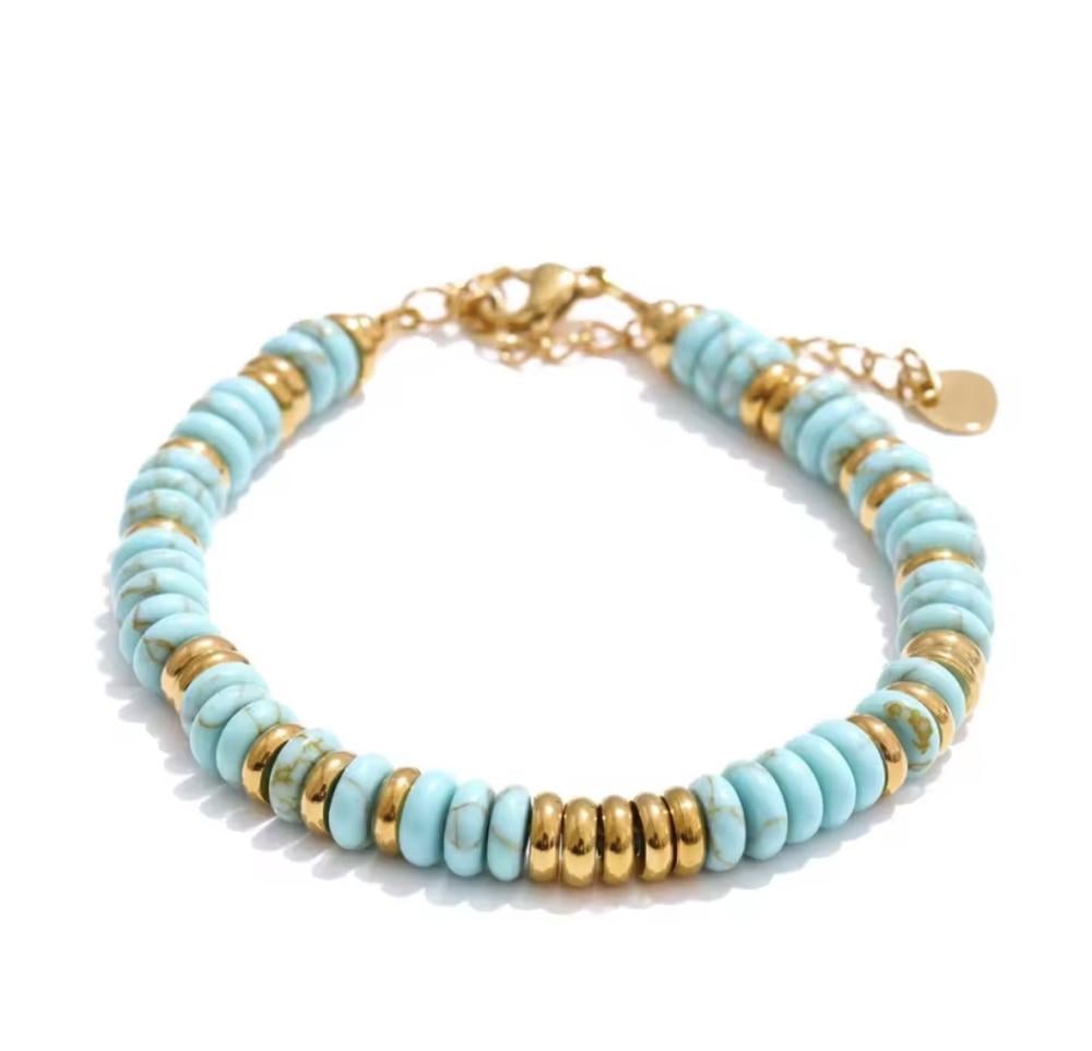 سوار بتصميم راقٍ يجمع بين الأناقة والتميّز، مصنوع من خرز حجر التركواز الطبيعي (Turquoise)، أحد الأحجار الكريمة النادرة نسبياً. يتميز هذا الحجر بجماله الطبيعي الفريد ومتانته التي جعلته خياراً راقياً في عالم المجوهرات منذ قرون. قطعة تضيف لمسة فخامة راقية إلى أي إطلالة.