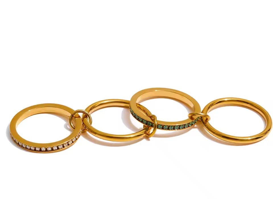 طقم أنيق يضم أربعة خواتم بتصاميم متنوعة تجمع بين البساطة والفخامة. منها الكلاسيكي الناعم، ومنها المرصّع بفصوص لامعة باللونين الأبيض والأخضر، ما يمنحك خيارات متعددة لإطلالات مختلفة. يمكنك ارتداؤها مجتمعة لإطلالة جريئة، أو توزيعها منفردة لإطلالة بسيطة وراقية.